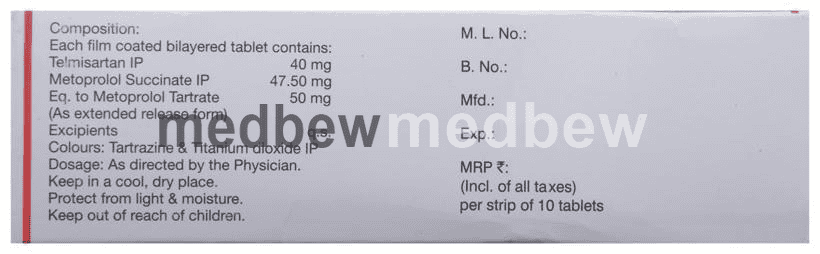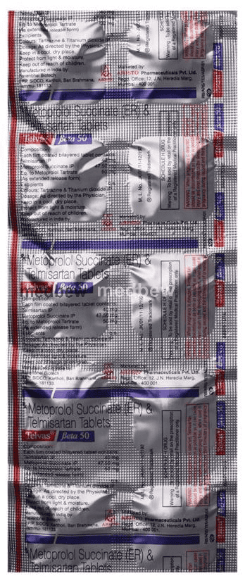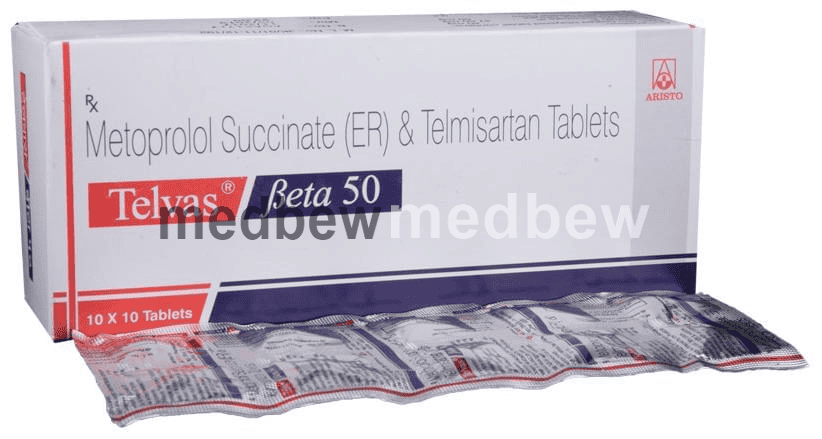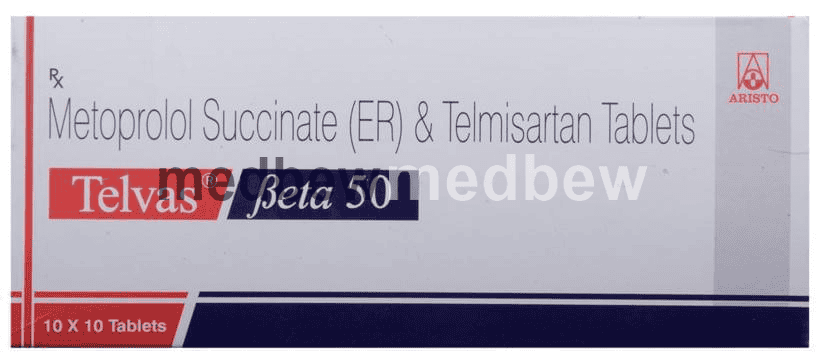 Telvas Beta 50 Tablet ER is a medicine used for treating high blood pressure. By lowering the blood pressure, it helps in preventing future heart attack and stroke. Early treatment with this medicine also improves chances of survival in patients of heart attack.