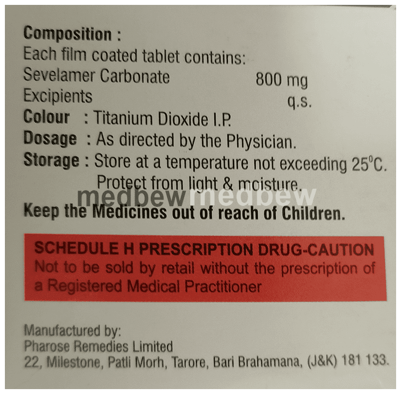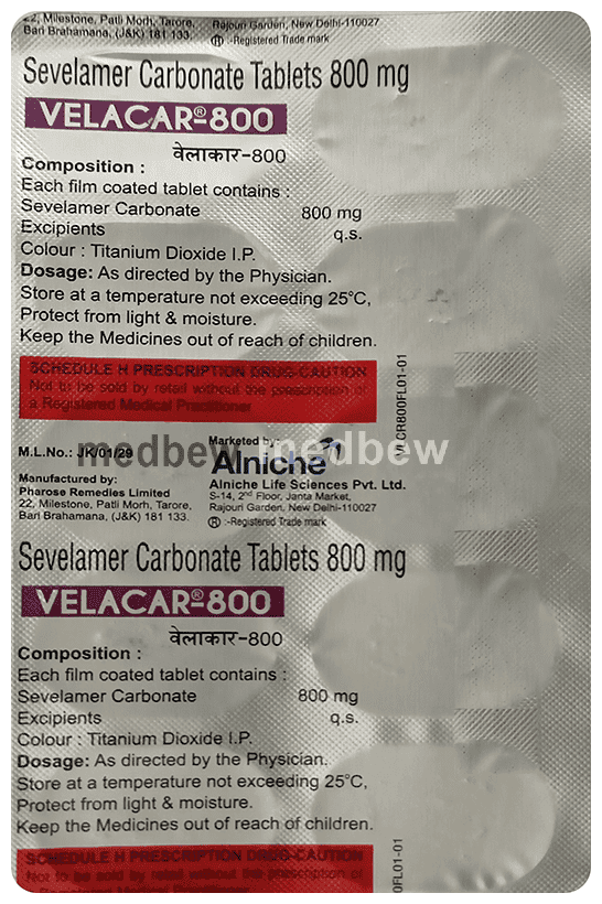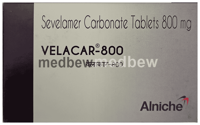 Velacar 800mg Tablet is used to treat increased phosphate levels in the blood. It is used in patients who are on dialysis due to severe kidney disease. It inhibits the absorption of phosphate from the intestine and lowers the phosphate levels in the blood.