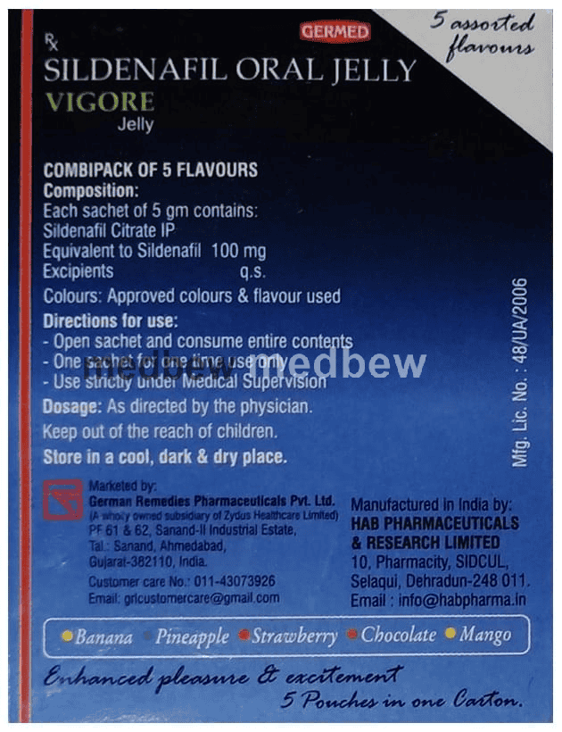 Vigore Oral Jelly (5gm Each) 5 Assorted Flavours may be taken on an empty stomach or with a meal. It should be strictly taken as advised by your doctor. You should take about 1 hour before you plan to have sex. The amount of time it takes to work varies from person to person, but it normally takes between 30 minutes and 1 hour. This medicine will only help you to get an erection if you are sexually stimulated. However, you should not take this medicine if you do not have erectile dysfunction. It should not be taken more than once a day.The most common side effects of this medicine are flushing (sense of warmth), headache, dizziness, blurred vision, muscle pain, stomach upset, and rash. Talk to your doctor if any of the side effects bother you or do not go away.This medicine is not intended for use by women and men should avoid using any other medicines to treat impotence without talking to a doctor first. It can be dangerous to take it along with medicines called nitrates (often given for chest pain or angina). Do not take this medicine if you have severe heart or liver problems, have recently had a stroke or heart attack or if you have low blood pressure. Let your doctor know if you suffer from these or any other health problems before taking it. You should not drive if this medicine makes you feel dizzy. Avoid drinking alcohol while taking this medicine as it increases the chances of side effects.