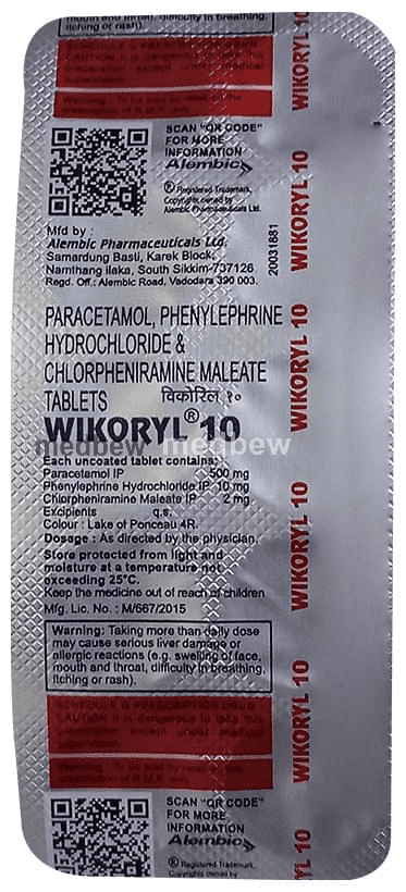 Wikoryl 10 Tablet is a medicine used in the treatment of common cold symptoms. It provides relief from symptoms such as headache, sore throat, runny nose, muscular pain, and fever.