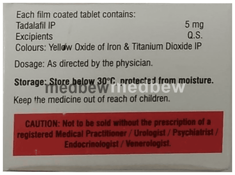Yaw 5 Tablet is a phosphodiesterase (PDE-5) inhibitor. It works in erectile dysfunction by increasing blood flow to penis by relaxing the muscles in penile blood vessels.